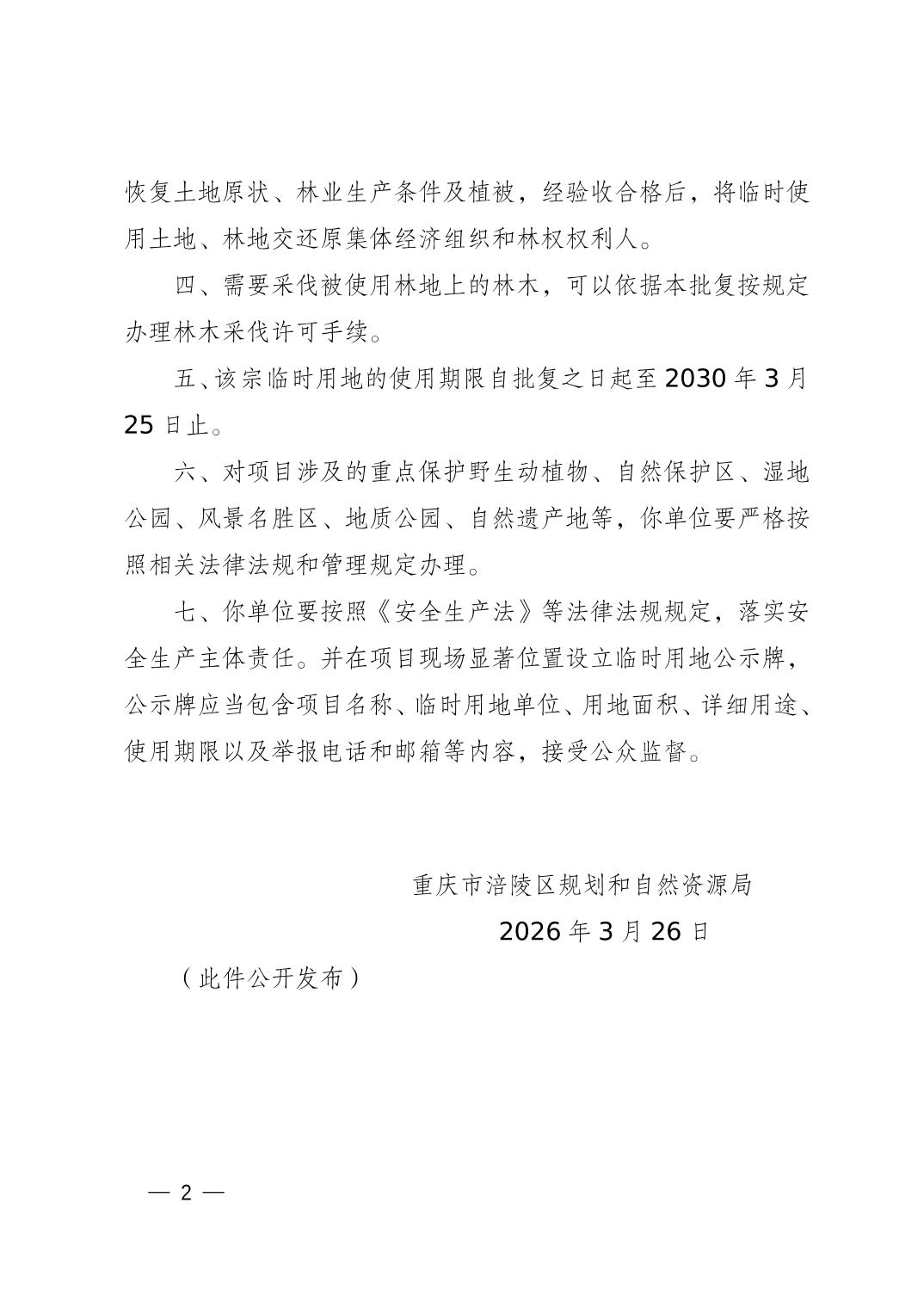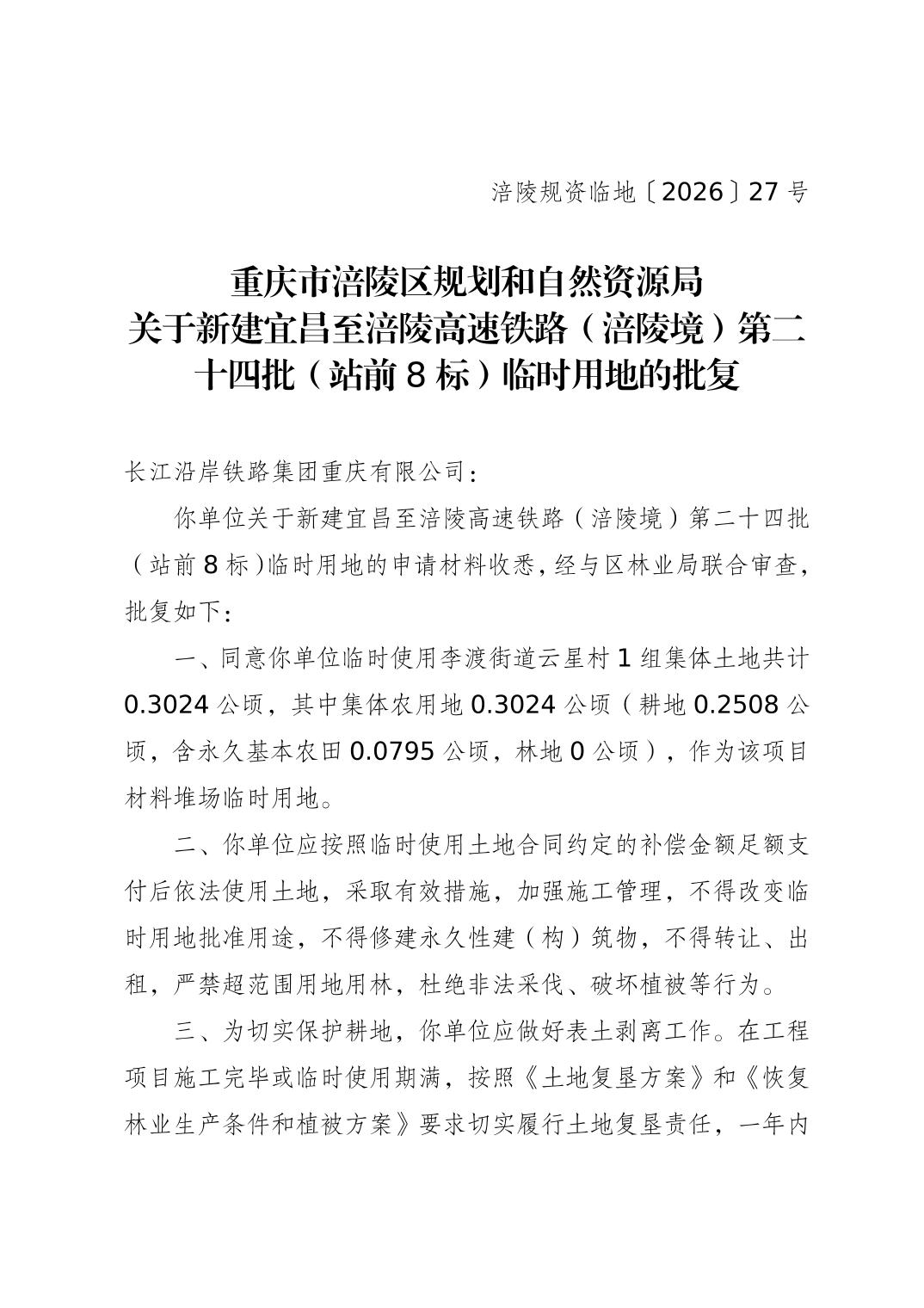涪陵规资临地[2026] 27号关于新建宜昌至涪陵高速铁路(涪陵境)第二十四批(站前8标)临时用地的批复