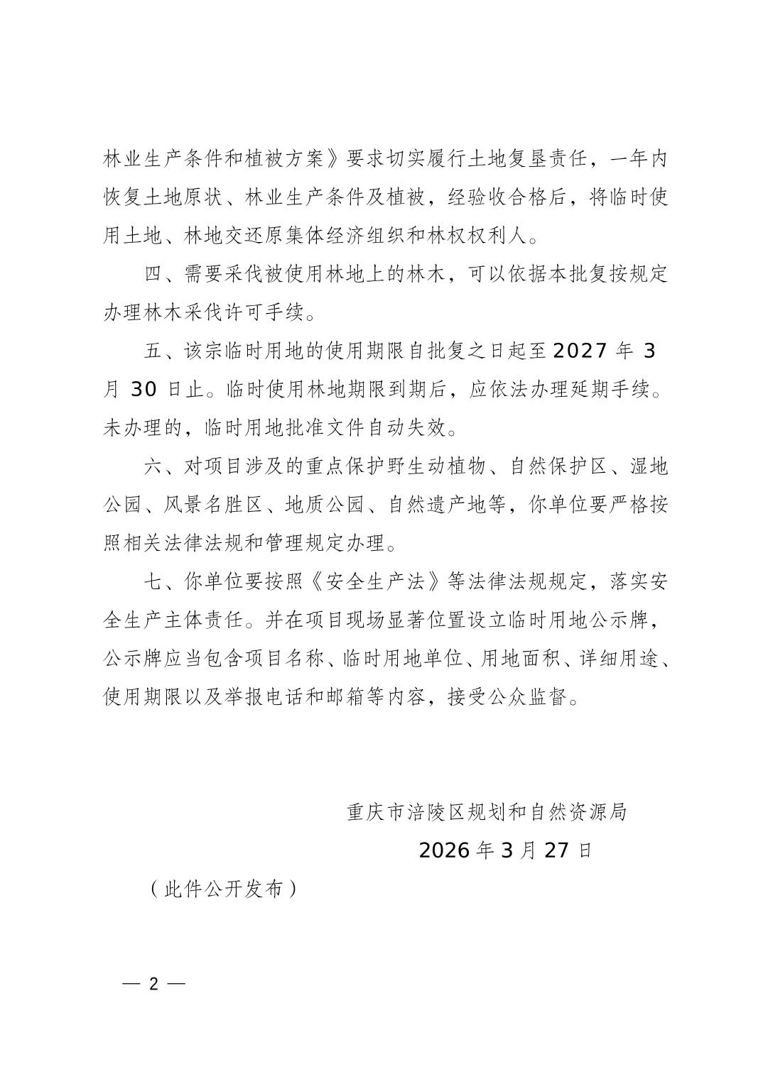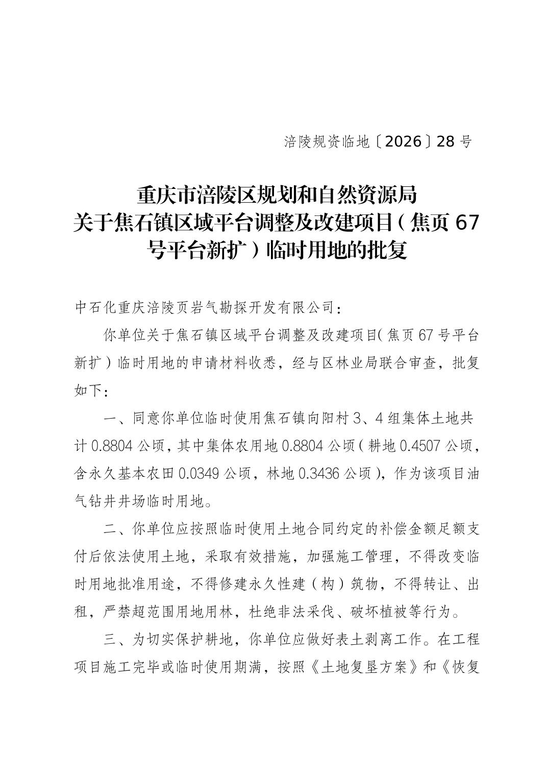 涪陵规资临地[2026]28号 关于焦石镇区域平台调整及改建项目(焦页67号平台新扩)临时用地的批复