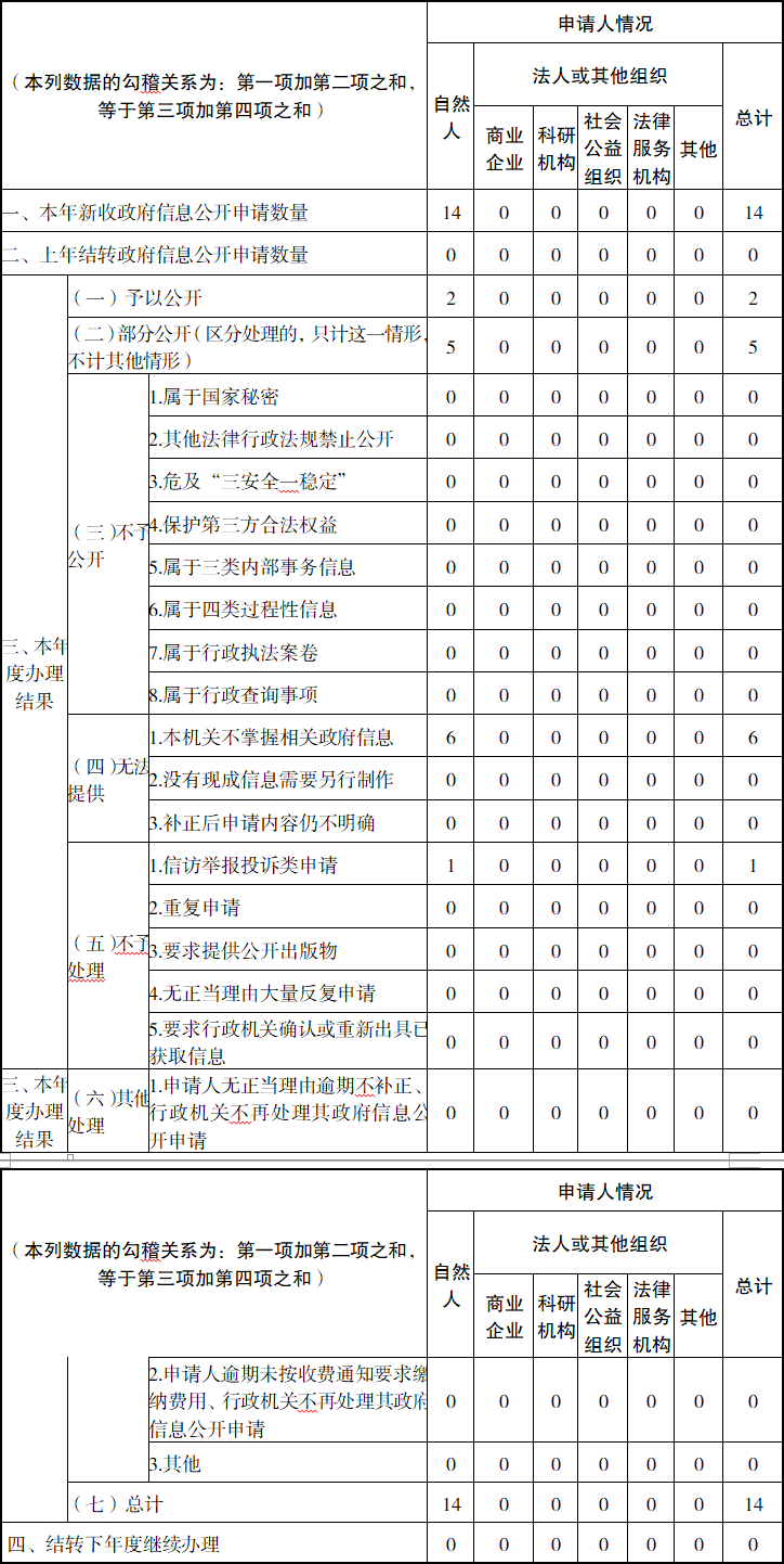 (二)依申请公开办理情况。严格依照《中华人民共和国政府信息公开条例》规定,规范受理、审查、答复全流程管理,依法高效回应社会关切。全年共收到政府信息公开申请14件,均在法定期限内办结并答复申请人,办结率达100%。