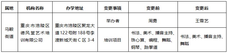 根据《中华人民共和国民办教育促进法》《中华人民共和国行政许可法》等相关法律法规和《重庆市非学科类校外培训机构设置标准和管理指南(试行)》以及“双减”工作有关规定,现将拟同意非学科类校外培训机构变更事项予以公示。