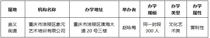 根据《中华人民共和国民办教育促进法》《中华人民共和国行政许可法》等相关法律法规和“双减”工作有关规定,通过对重庆市涪陵区象元艺术培训有限公司的申报材料和办学场地进行审核和评估,重庆市涪陵区象元艺术培训有限公司符合设置标准,具备相应的办学条件,现进行设立前公示。