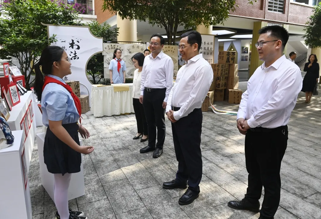 走进校园,黎勇、董奕锋详细了解学校办学特色和发展情况,仔细观看科创成果和学生作品展示。在与孩子们的交流中,黎勇鼓励他们牢记嘱托、感恩奋进,锻炼好身体、培养好习惯、塑造好性格,努力成为合格的社会主义事业接班人。