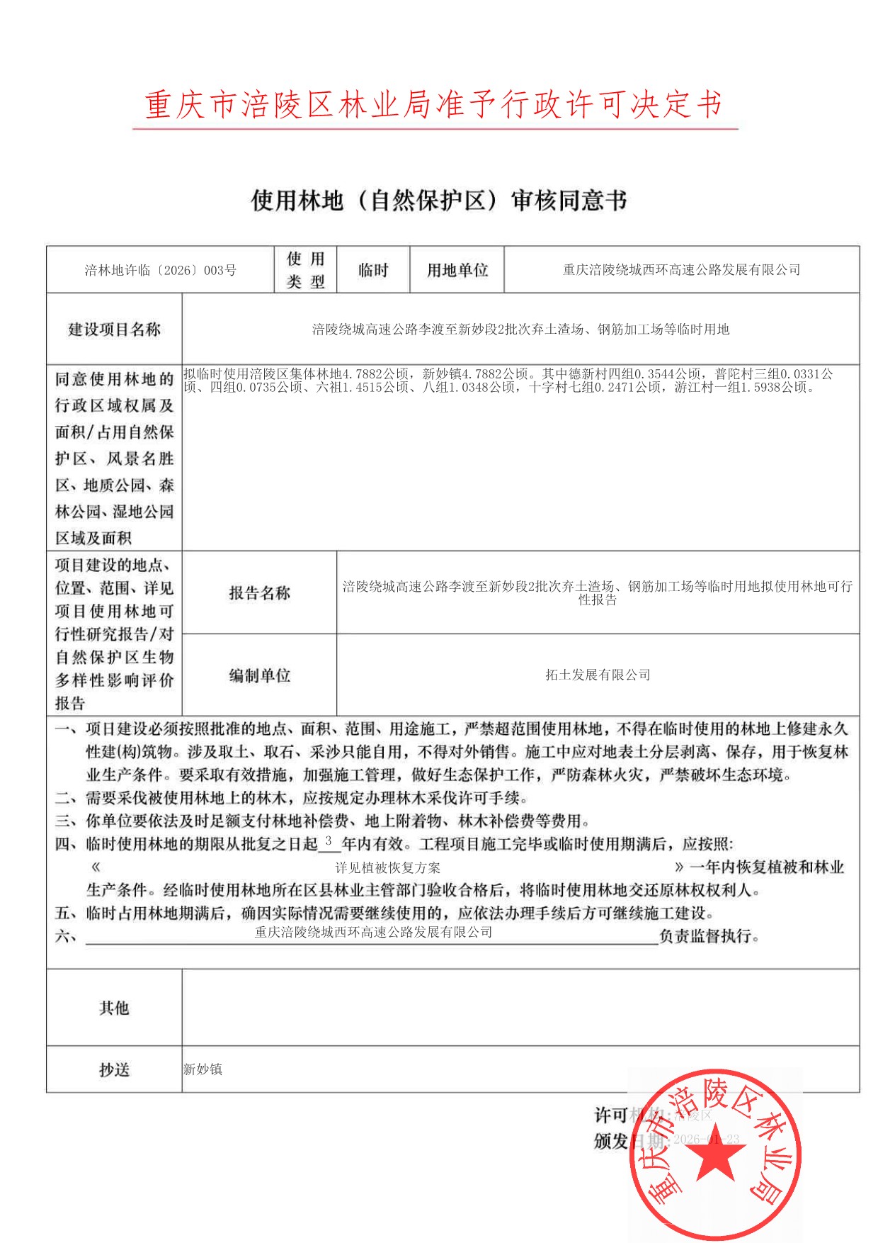 关于涪陵绕城高速公路李渡至新妙段2批次弃土渣场、钢筋加工场等临时用地使用林地审核同意书
