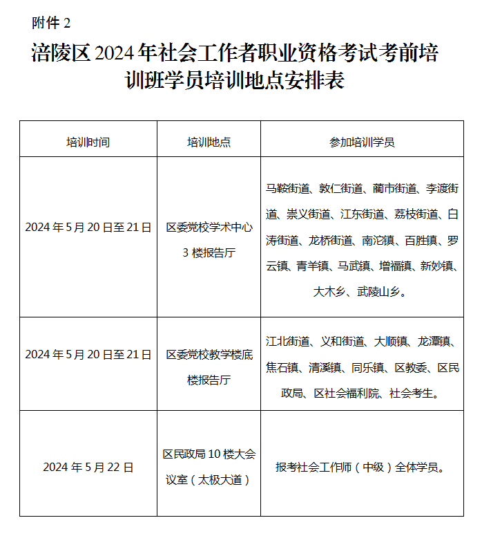 2.涪陵区2024年社会工作者职业资格考试考前培训班学员培训地点安排表