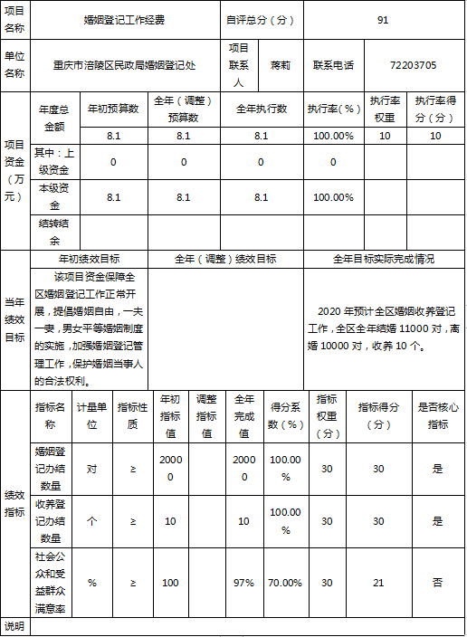 婚姻专项项目绩效目标自评综述:根据年初设定的绩效目标,项目总体完成情况来看,我单位2020年从工作保障、工作管理、工作效率等三方面着手,制定了详尽的总体绩效目标,从完成情况来看,工作保障方面,完善了信息化建设,提高了人员办事能力。与此同时为加强登记工作的管理,确保婚姻收养登记工作顺利开展,我单位做好年初预算,并做到了让群众高兴的来,满意的走。自评工作开展顺利,自评结果为优秀。项目全年预算数为8.1万元,上年结转为11.57万元,执行数为19.67万元,完成预算的100.0%。