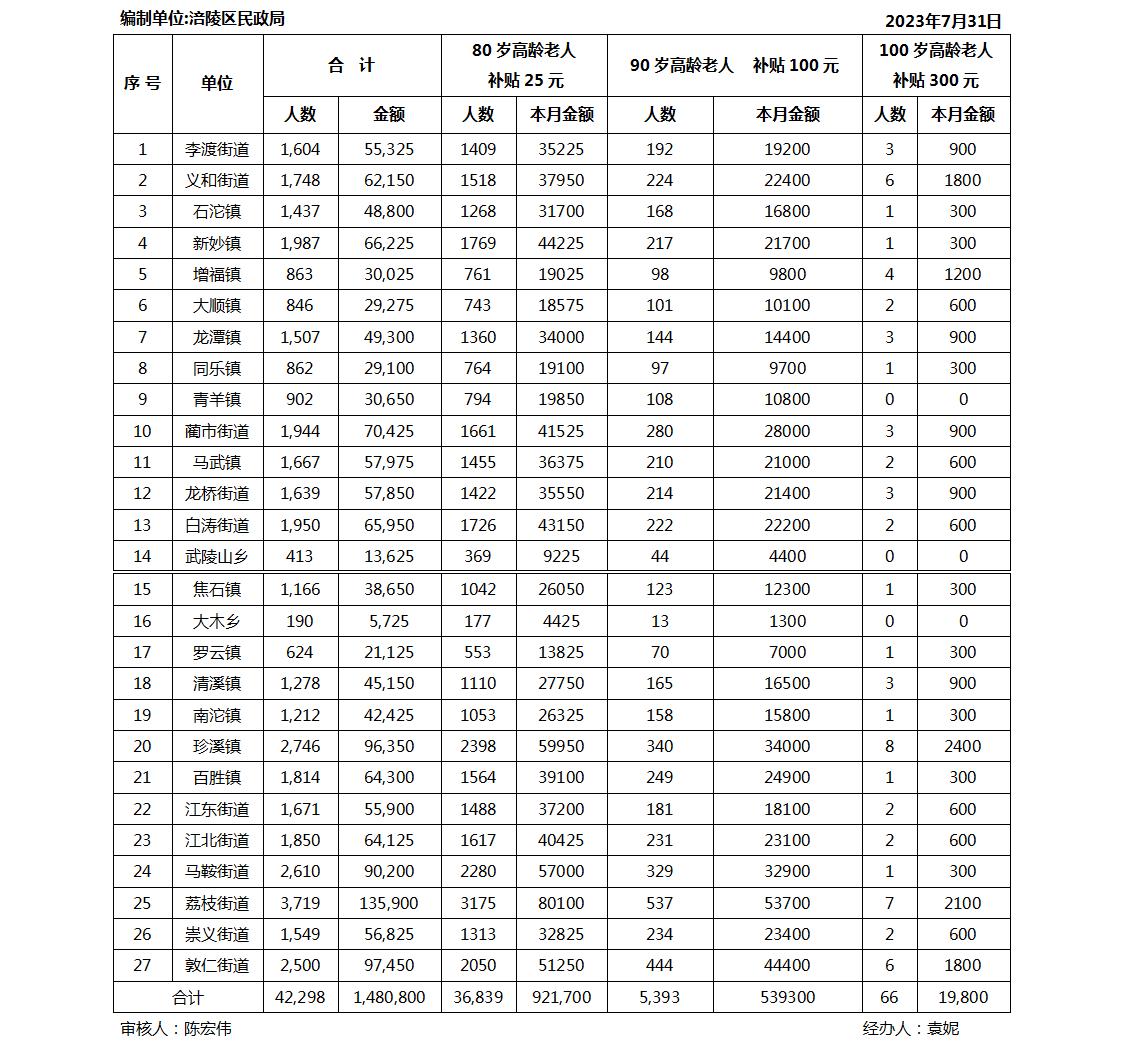 2023年7月涪陵区高龄津贴发放汇总表