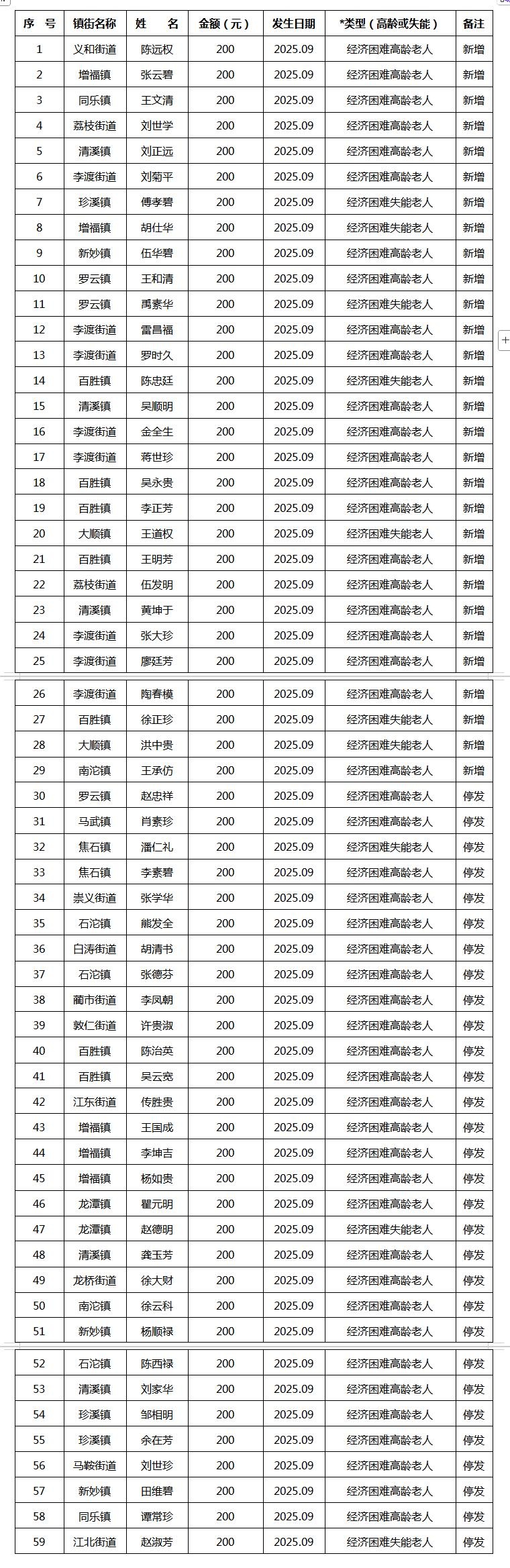 2025年9月涪陵区经济困难高龄失能老年人养老服务补贴新增、停发名单