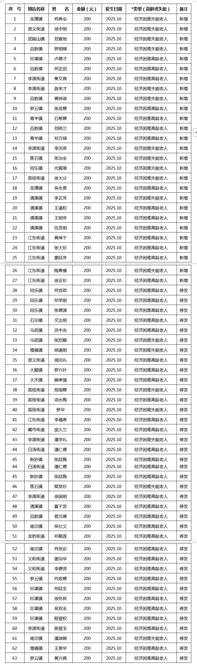 2025年10月涪陵区经济困难高龄失能老年人养老服务补贴新增、停发名单