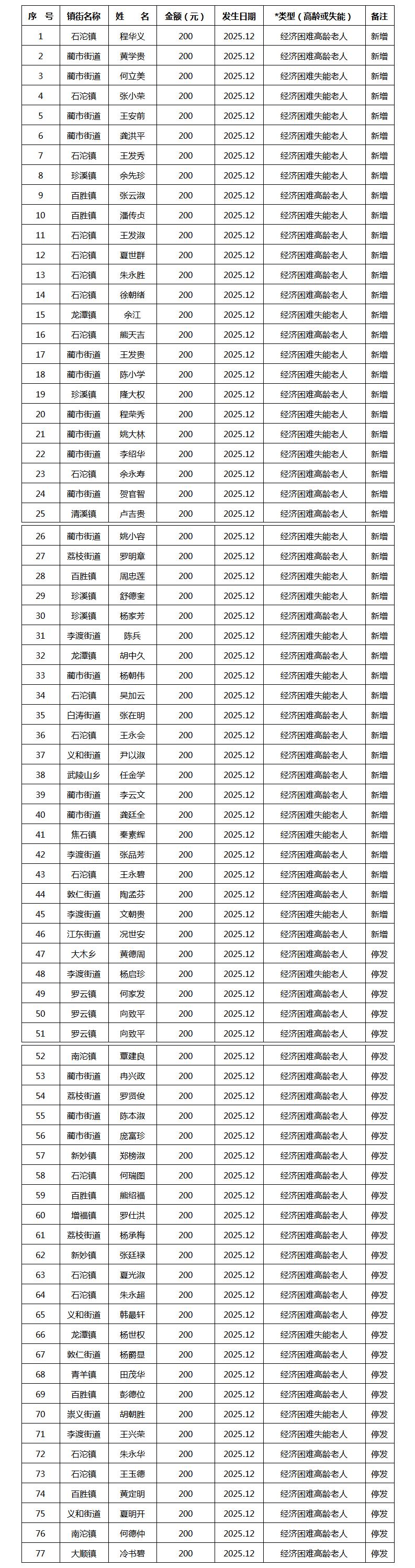 2025年12月涪陵区经济困难高龄失能老年人养老服务补贴新增、停发名单