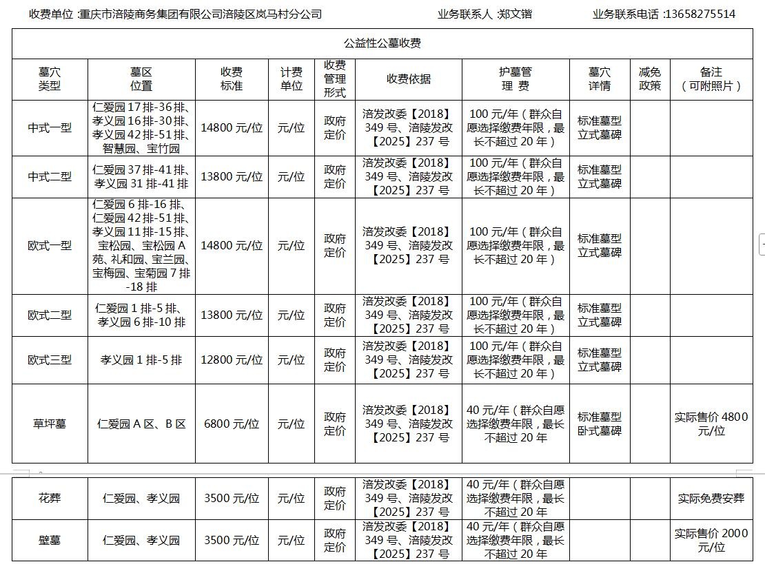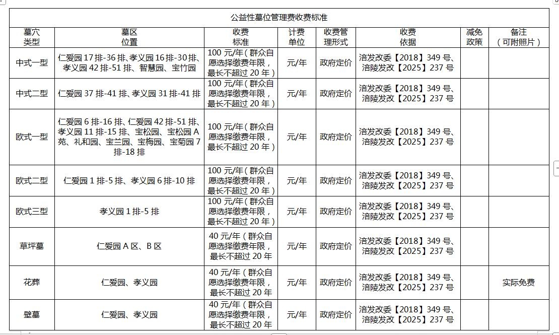 重庆市涪陵区宝鼎山陵园公益性公墓收费标准集中公示