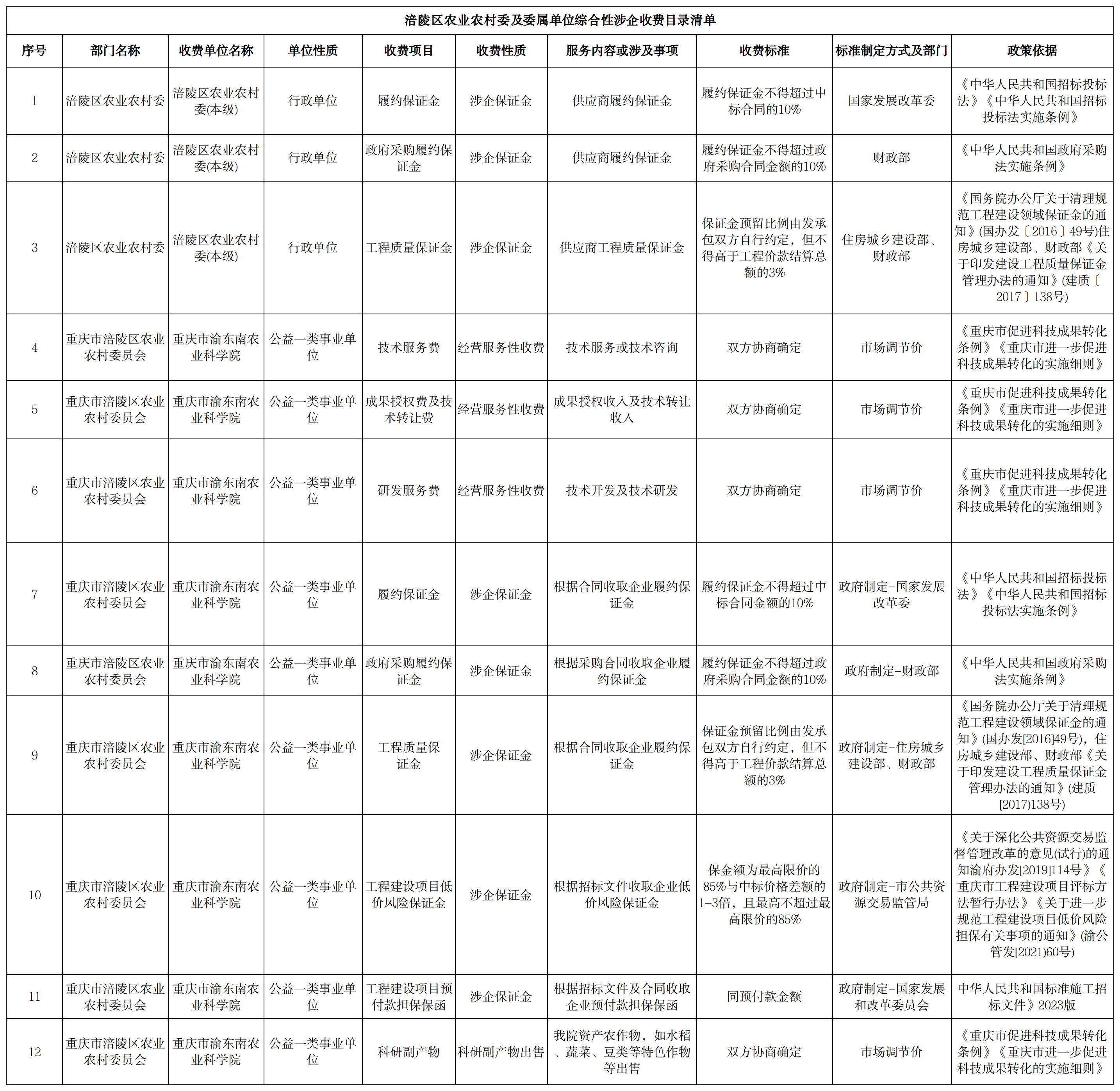 涪陵区农业农村委及委属单位综合性涉企收费目录清单