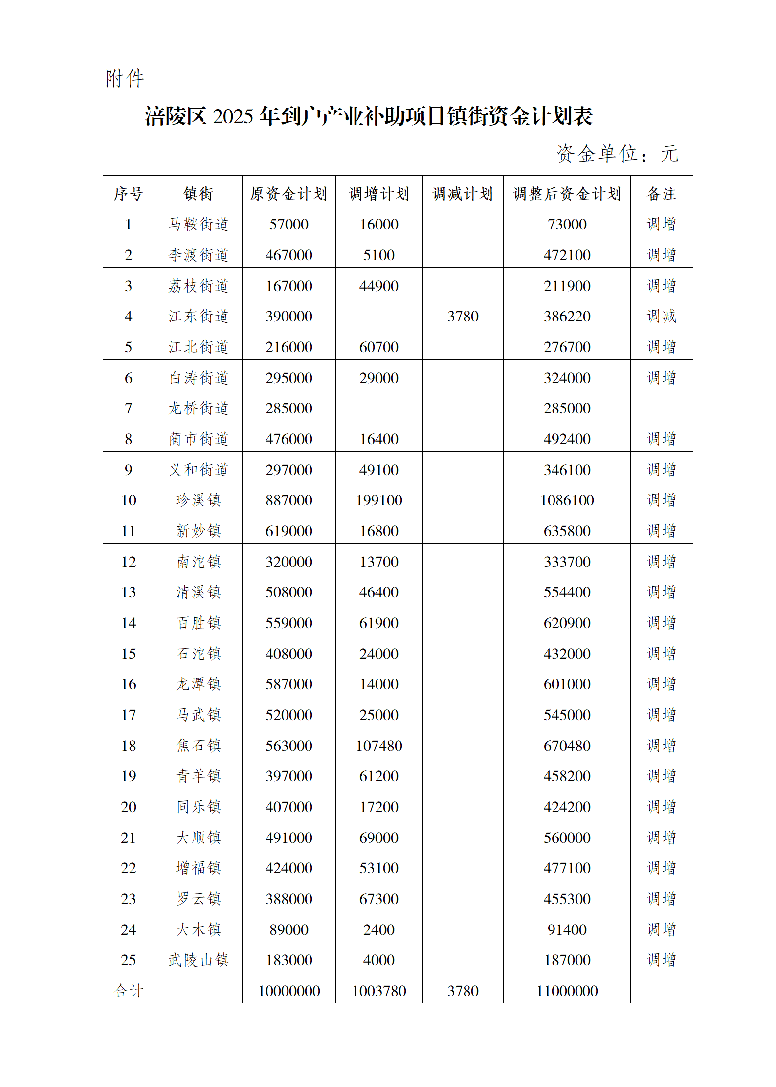 根据部分镇街道来函申请调整到户产业补助资金计划情况,《关于下达全区2025年第四批巩固脱贫攻坚成果和乡村振兴项目资金计划及调整部分已下达项目计划的通知》(涪陵农委发〔2025〕62号)对2025年到户产业补助项目资金计划调增了100万元,经研究,决定对2025年到户产业补助项目镇街资金计划进行调整(见附件),请各镇街按照《关于印发<涪陵区2025年到户产业补助项目实施方案>的通知》(涪陵农委发〔2025〕4号)工作要求,认真抓好项目建设。