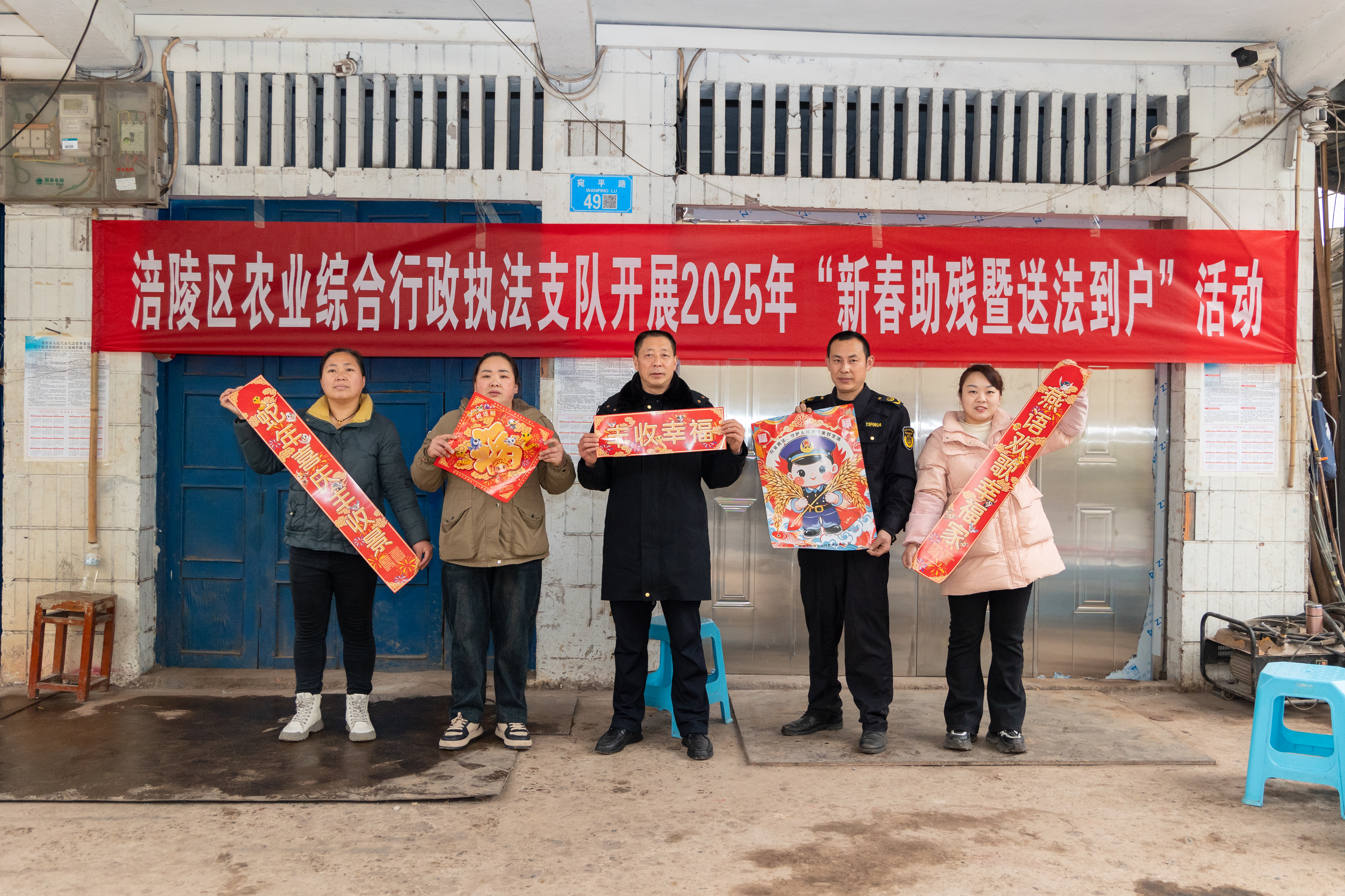 在2025年新春佳节来临之际,1月22日-23日,涪陵区农业综合行政执法支队开展“新春助残暨送法到户”活动。先后走访石沱镇、珍溪镇、义和街道、敦仁街道等地为60户残疾人朋友们送上温暖。旨在加大对残疾人普法维权工作力度,体现对残疾人的关心关怀,展现农业执法的“温度”。