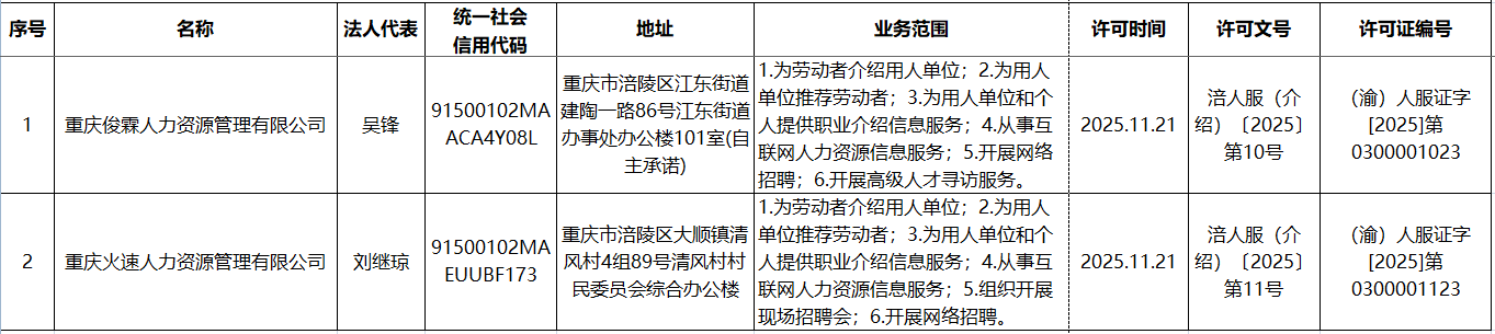 重庆市涪陵区人力资源和社会保障局职业中介活动准予行政许可决定书