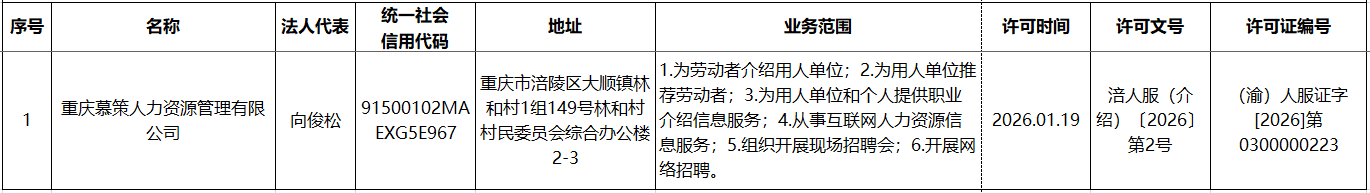 重庆市涪陵区人力资源和社会保障局职业中介活动准予行政许可决定书