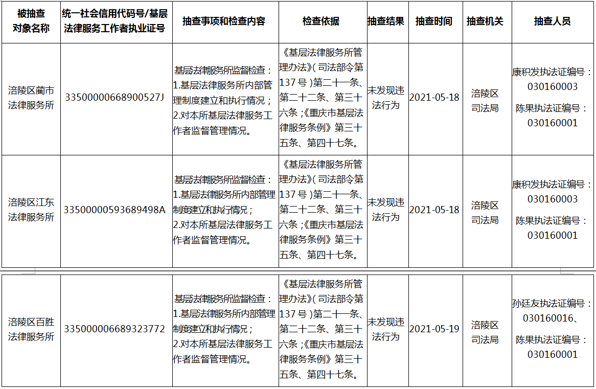 重庆市涪陵区司法局2021年上半年随机抽查结果公示 (基层法律服务所、基层法律服务工作者执业监督检查)
