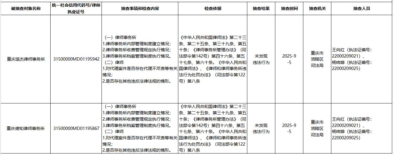 重庆市涪陵区司法局2025年下半年随机抽查结果公示 (律师事务所、律师)