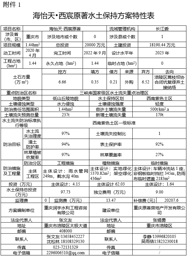 1. 海怡天•西宸原著水土保持方案特性表