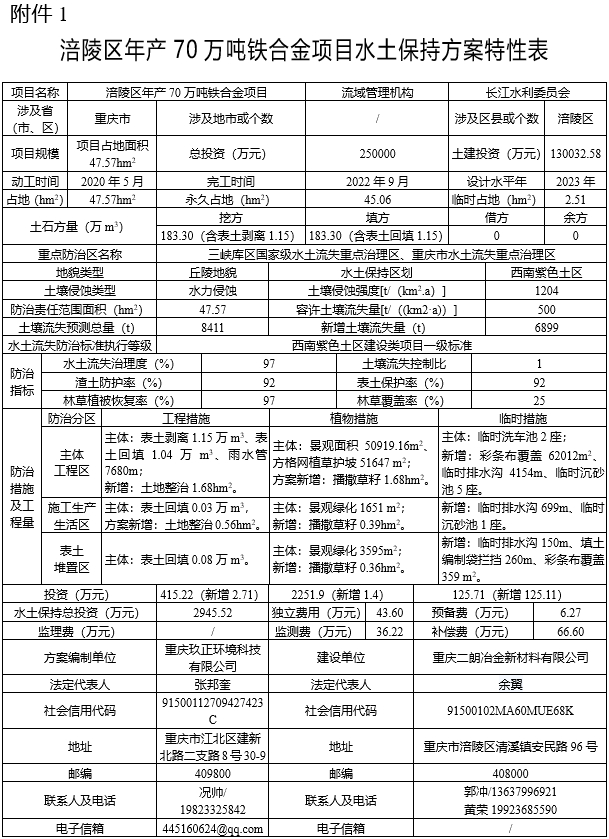 1. 涪陵区年产70万吨铁合金项目水土保持方案特性表