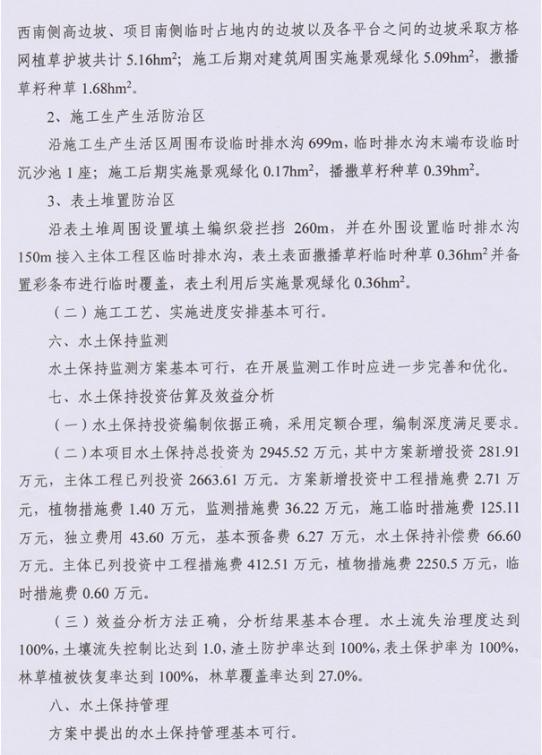 (三)同意水土流失防治目标为:水土流失治理度97%,土壤流失控制比1.0,渣土防护率92%,表土保护率92%,林草植被恢复率97%,林草覆盖率25%。