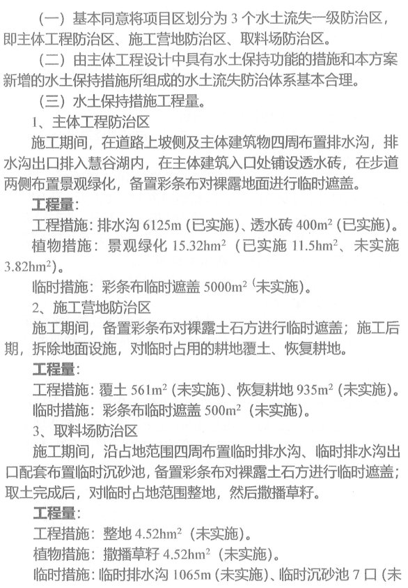 (四)水土流失防治责任范围分为主体工程防治区、施工营地防治区、取料场防治区等3个防治区;防治措施包括排水沟、景观绿化等。