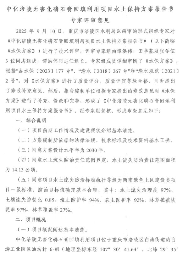 2.中化涪陵无害化磷石膏回填利用项目水土保持方案报告书专家评审意见