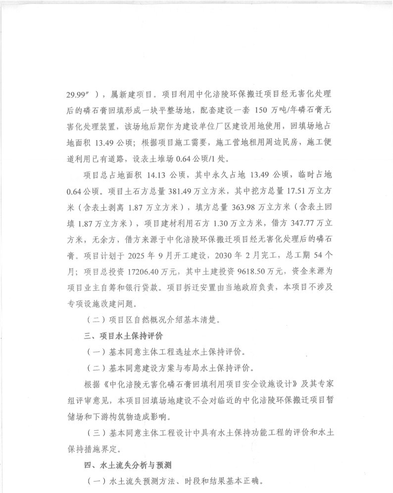 你单位送交的《中化涪陵无害化磷石膏回填利用项目水土保持方案报告书》收悉。经审查,该方案符合法定条件,决定准予行政许可。