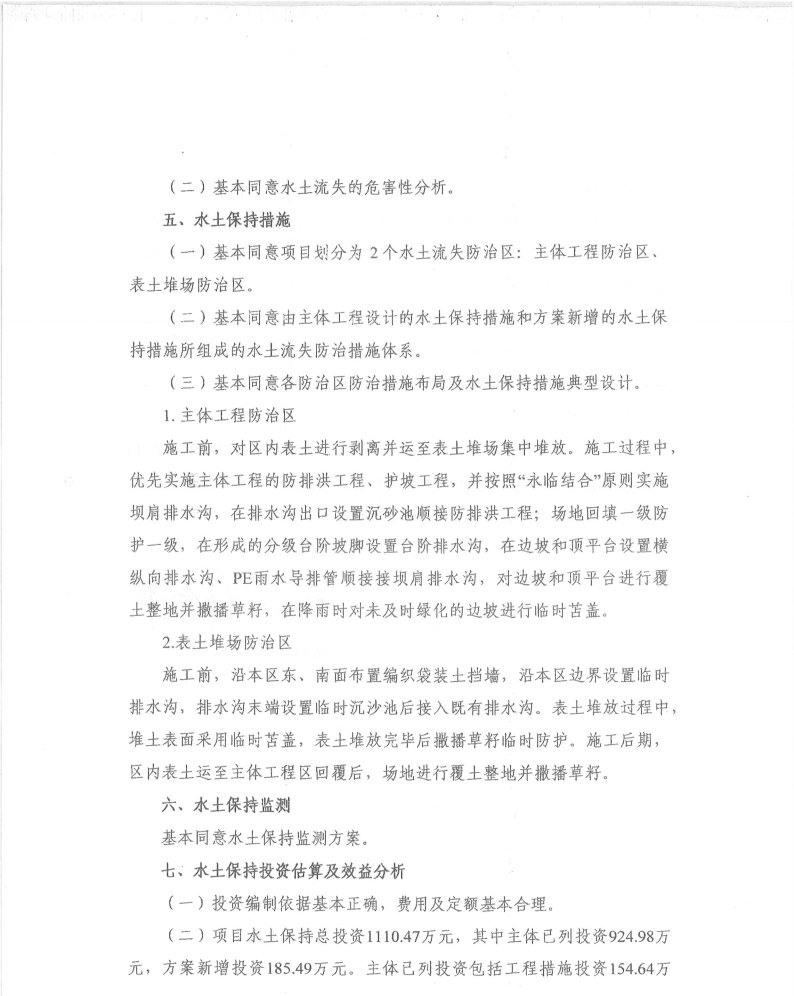 (四)水土流失防治责任范围分为主体工程防治区和表土场防治区等2 个防治区;防治措施包括撒草、排水沟等。