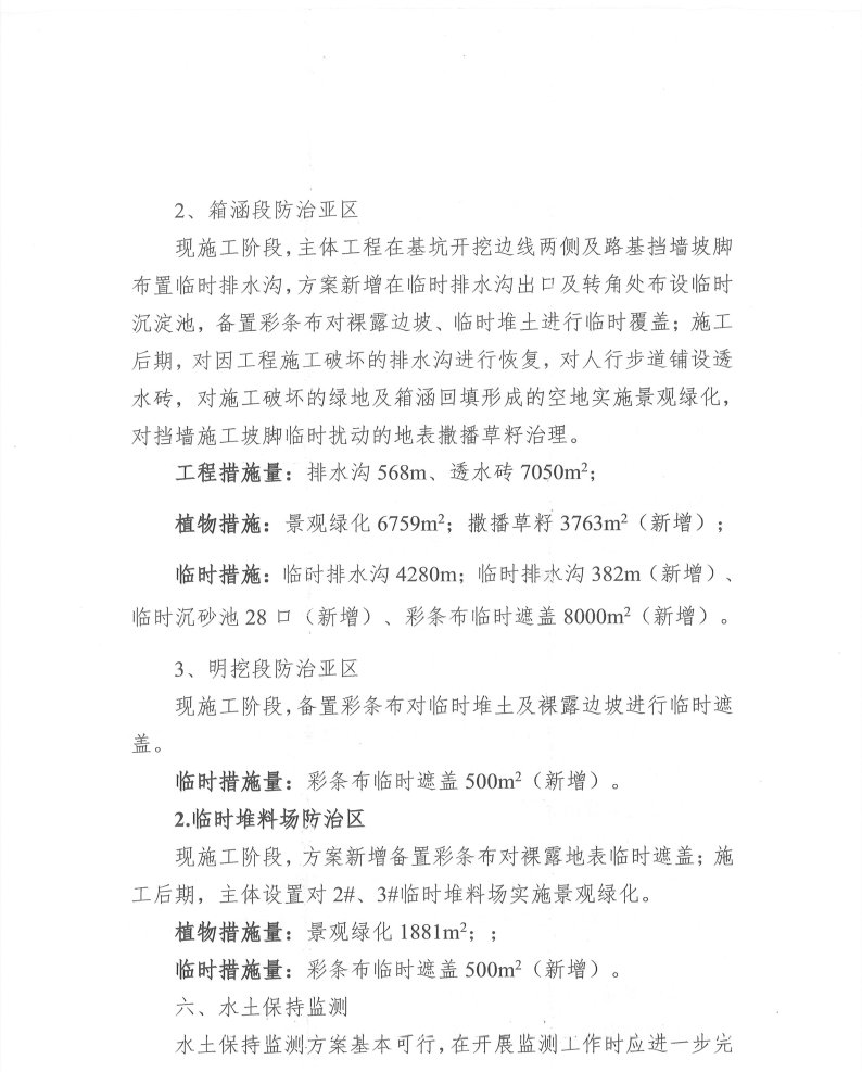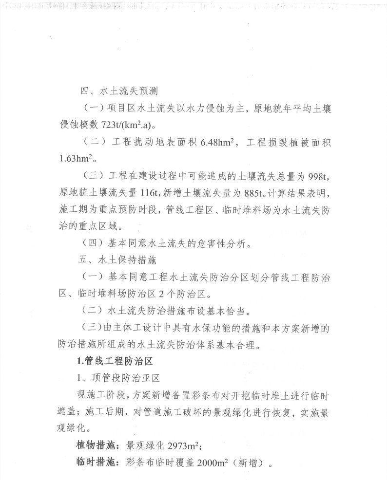 (四)水土流失防治责任范围分为管线工程防治区和临时堆料场防治区等2个防治区;防治措施包括景观绿化、排水沟等。
