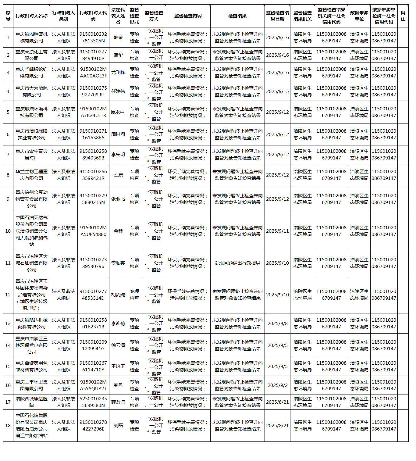 涪陵区生态环境局2025年第三季度双随机执法检查信息公开第三批