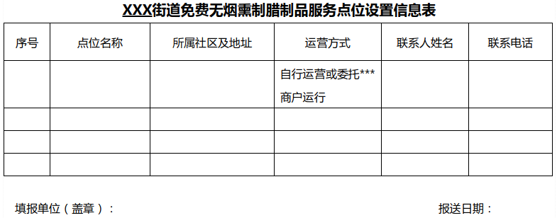 附件:XXX 街道腊制品免费无烟熏制服务点位设置信息表