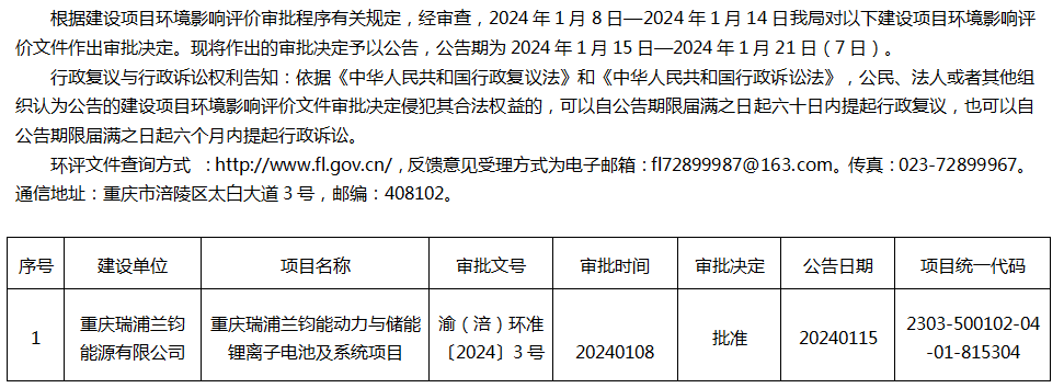 涪陵区生态环境局关于重庆瑞浦兰钧能源有限公司项目环评审批决定公告20240115