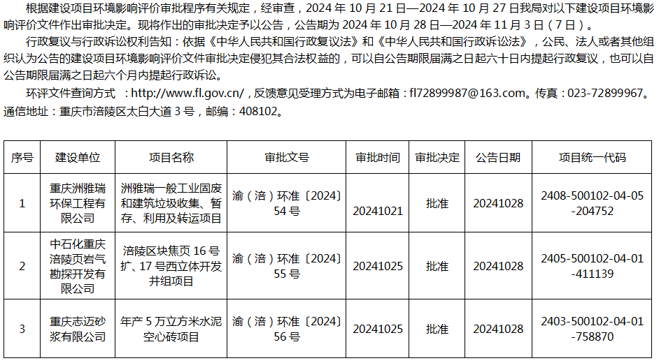 涪陵区生态环境局关于重庆洲雅瑞环保工程有限公司、中石化重庆涪陵页岩气勘探开发有限公司、重庆志迈砂浆有限公司项目环评审批决定公告20241028