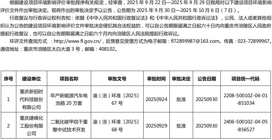 涪陵区生态环境局关于重庆新铝时代科技股份有限公司、重庆建峰化工股份有限公司项目环评审批决定公告20250930