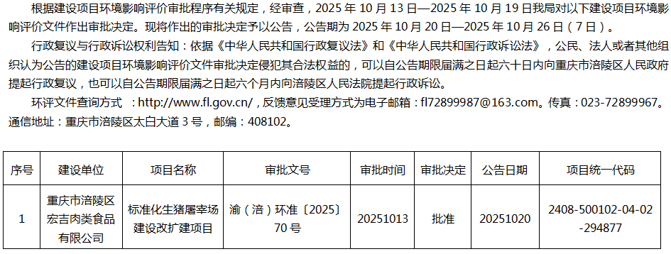 涪陵区生态环境局关于重庆市涪陵区宏吉肉类食品有限公司项目环评审批决定公告20251020
