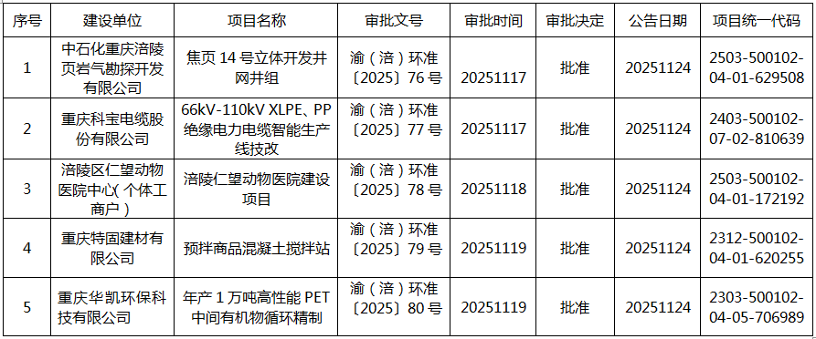 根据建设项目环境影响评价审批程序有关规定,经审查,2025年11月17日—2025年11月23日我局对以下建设项目环境影响评价文件作出审批决定。现将作出的审批决定予以公告,公告期为2025年11月24日—2025年11月30日(7日)。