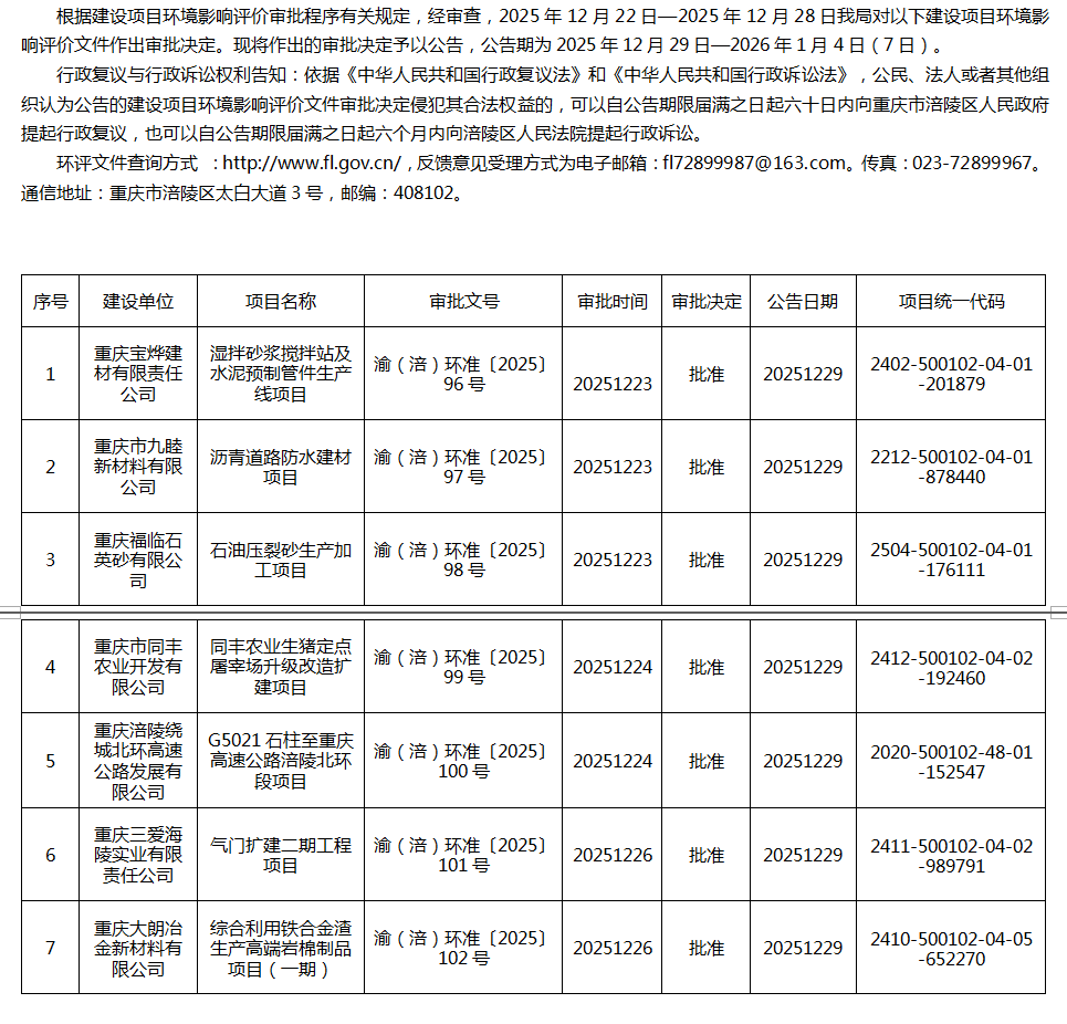 涪陵区生态环境局关于重庆宝烨建材、重庆市九睦新材料、重庆福临石英砂、重庆市同丰农业、涪陵绕城北环高速公路、三爱海陵、大朗冶金公司项目环评审批决定公告20251229