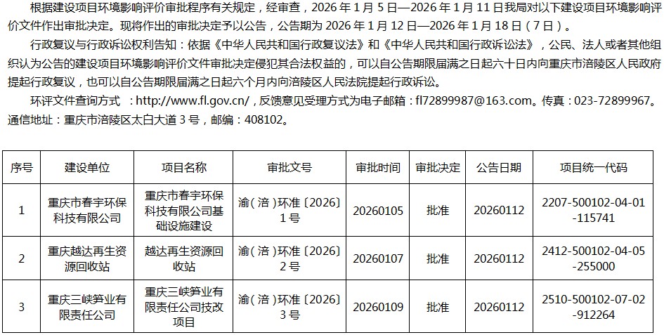 - 涪陵区生态环境局关于重庆市春宇环保科技有限公司、重庆越达再生资源回收站、重庆三峡笋业有限责任公司项目环评审批决定公告20260112