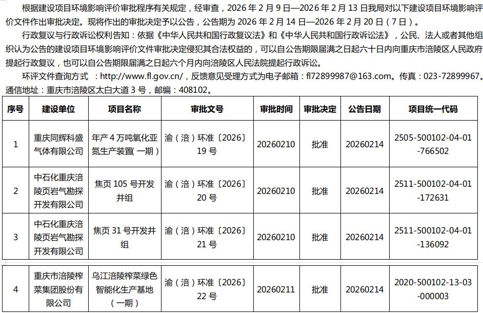 - 涪陵区生态环境局关于重庆同辉科盛气体有限公司、中石化重庆涪陵页岩气勘探开发有限公司、重庆市涪陵榨菜集团股份有限公司项目环评审批决定公告20260214