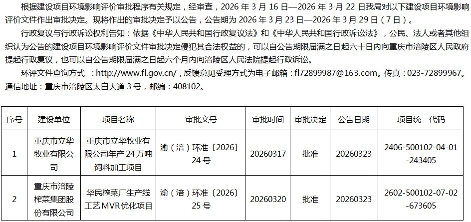 涪陵区生态环境局关于重庆市立华牧业有限公司、重庆市涪陵榨菜集团股份有限公司项目环评审批决定公告20260323