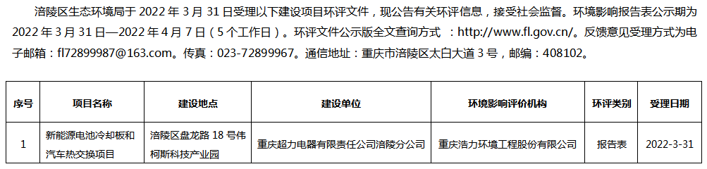 涪陵区生态环境局受理超力电器涪陵分公司建设项目环评信息公告20220331