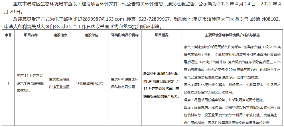 涪陵区生态环境局审查华峰铝业有限公司建设项目环评信息公示表20220414