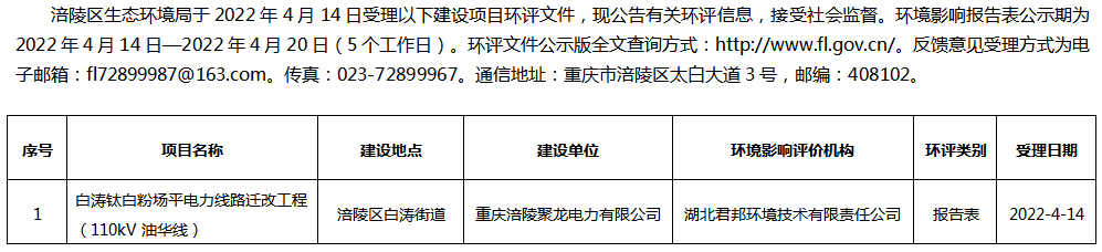 涪陵区生态环境局受理涪陵聚龙电力有限公司建设项目环评信息公告20220414