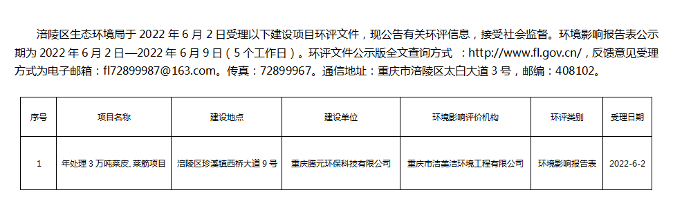 涪陵区生态环境局受理重庆腾元环保科技有限公司项目环评信息公告20220602