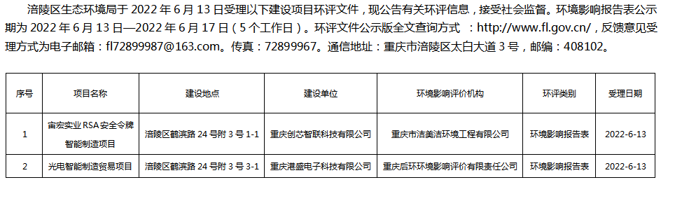 涪陵区生态环境局受理创芯智联、港盛电子科技有限公司项目环评信息公告20220613