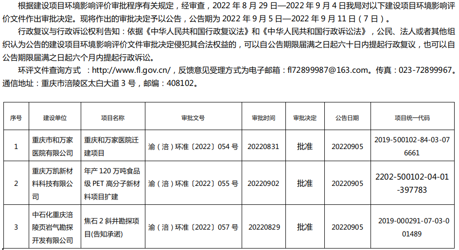 涪陵区生态环境局关于重庆市和万家医院有限公司、重庆万凯新材料科技有限公司、中石化重庆涪陵页岩气勘探开发有限公司项目环评审批决定公告20220905