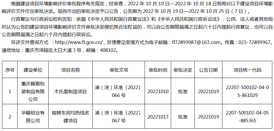 涪陵区生态环境局关于重庆峰顺包装制品有限公司、华峰铝业有限公司项目环评审批决定公告20221019