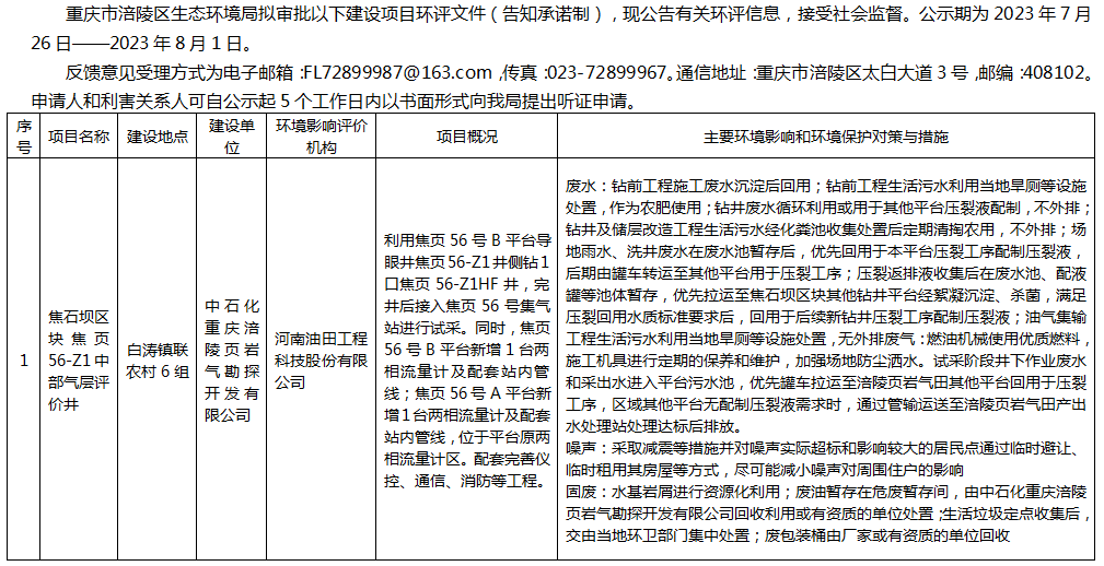 涪陵区生态环境局拟审批中石化重庆涪陵页岩气勘探开发有限公司环评信息公示表(告知承诺制)20230726