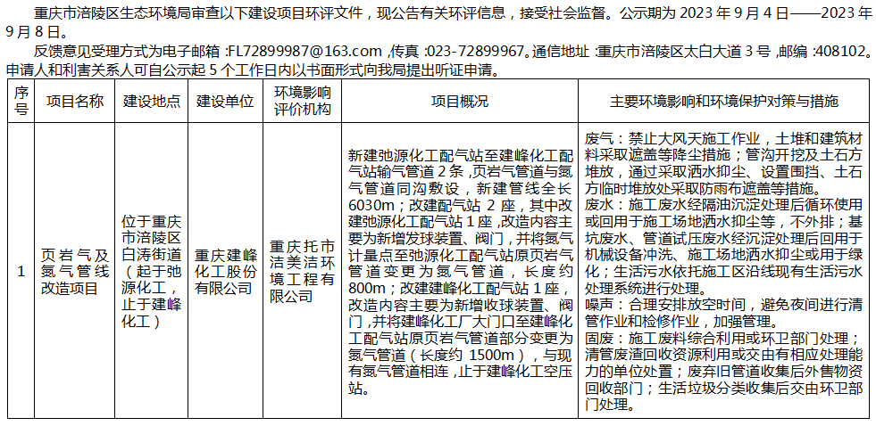 涪陵区生态环境局审查重庆建峰化工股份有限公司页岩气及氮气管线改造项目环评信息公示20230904