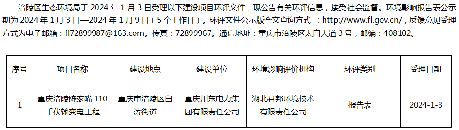 涪陵区生态环境局受理重庆川东电力集团有限责任公司建设项目环评信息公告20240103